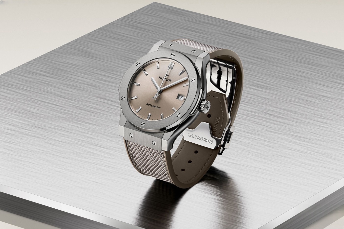 At the heart of the design is the “Taupe” sunray dial—a refined color tone that lies between grey and brown. This neutral yet charismatic shade is increasingly popular in haute horlogerie, fine jewelry, and luxury interior design. The dial is clean and elegant, featuring a date window at 3 o’clock with no unnecessary distractions—an ideal choice for those who appreciate timeless minimalism in a Hublot replica watch.