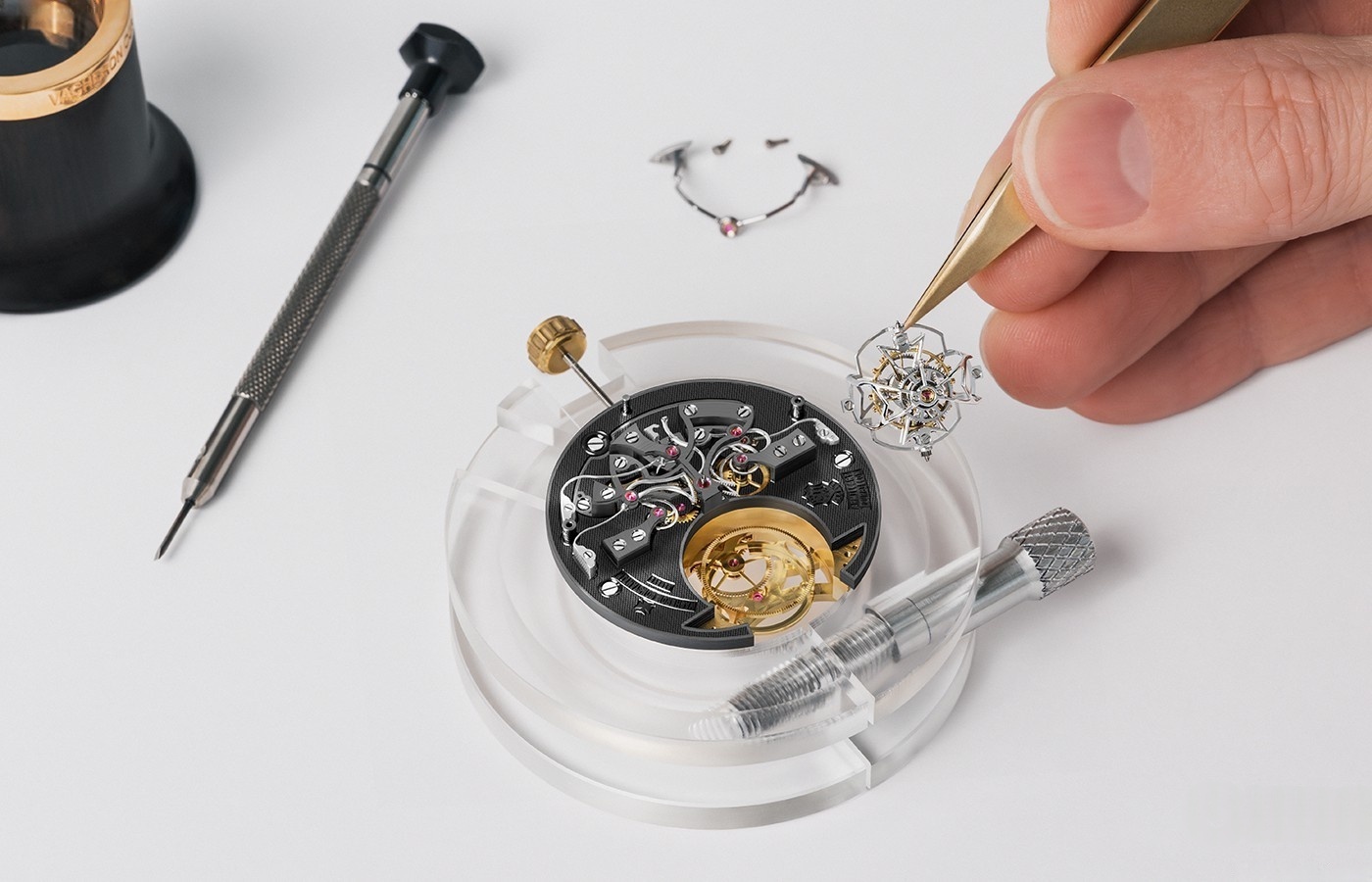 The dial showcases dual retrograde hour and minute displays with Roman and Arabic numerals respectively, just like the original. The sapphire crystal reveals the mesmerizing dual-axis tourbillon at 9 o’clock, rotating with impeccable smoothness.